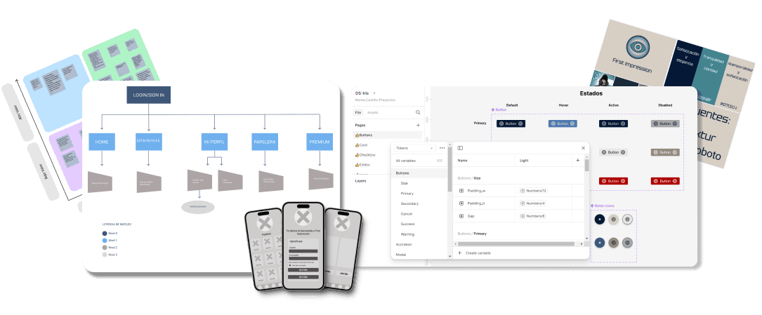 Mediante el uso de una matriz 2x2 y un ejercicio de card sorting validado a través de pruebas con múltiples usuarios, definí la arquitectura de la información y desarrollé los wireframes de media fidelidad. Posteriormente, diseñé la Identidad Visual Corporativa (IVC) y el Sistema de Diseño (DS), denominado ‘Iris’.