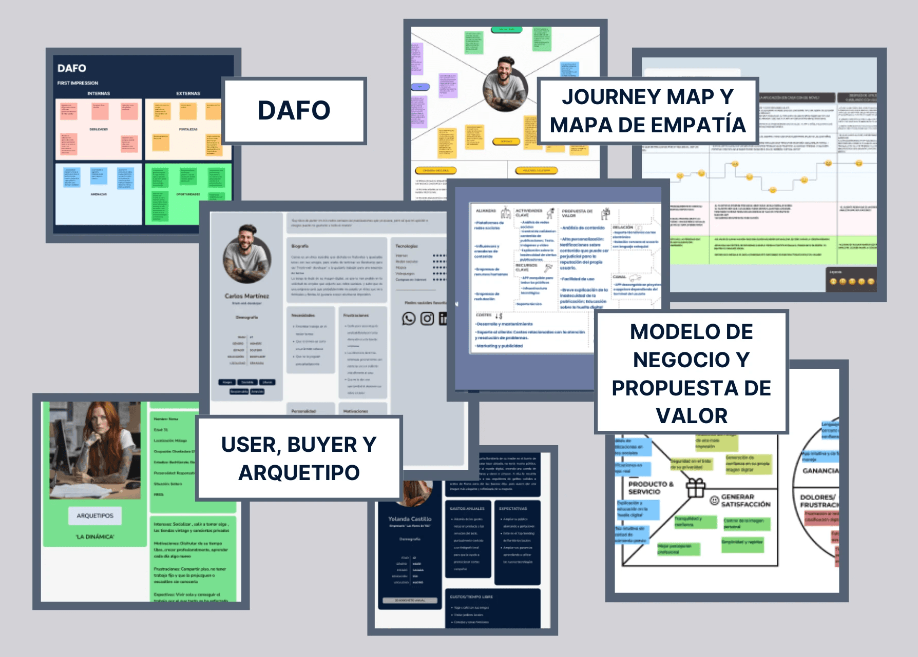 Tras un DAFO que reveló oportunidades de expansión, se definió vender la aplicación también a empresas, integrándola en RRHH y marketing. Se crearon perfiles de usuario (User persona, Buyer y Arquetipo) y con herramientas como el Journey Map y Mapa de Empatía, obtuve insights clave: ofrecer dos redes sociales gratuitas, garantizar seguridad y consentimiento, y ayudar a los usuarios a mejorar su perfil laboral. Finalmente, se desarrolló una Propuesta de Valor y Modelo de Negocio, destacando ventajas y diferenciadores frente a la competencia.