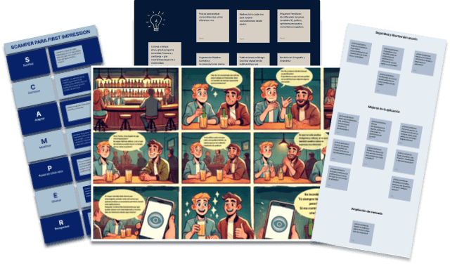 Donde, mediante las técnicas Brainstorming, SCAMPER y HMW? junto a la herramienta Storyboard, ideé la aplicación. Haciéndome una idea de qué podría ser el MVP 1 y qué debería dejar para futuribles, organizando el tiempo limitado para la implantación.